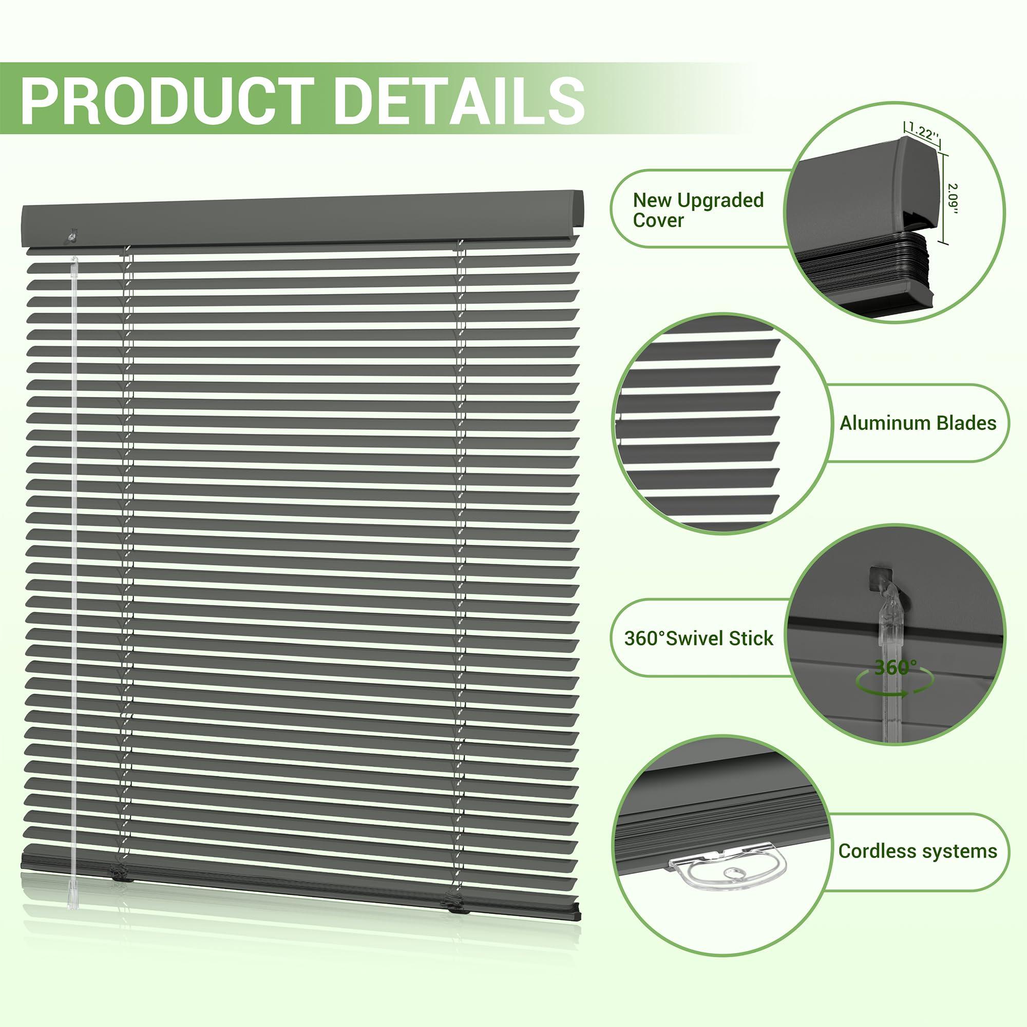 • Product FeaturesHigh QualityOur mini blinds are made of aluminum alloy, the high quality material makes the blinds more sturdy. The fully upgraded blackout cover shell design not only improves the overall aesthetics of the blinds, but also greatly enhances the blackout effect. EASY ADJUSTMENT Just gently turn the rotating rod, the Venetian blinds blades can be quickly rotated to control the light easily.