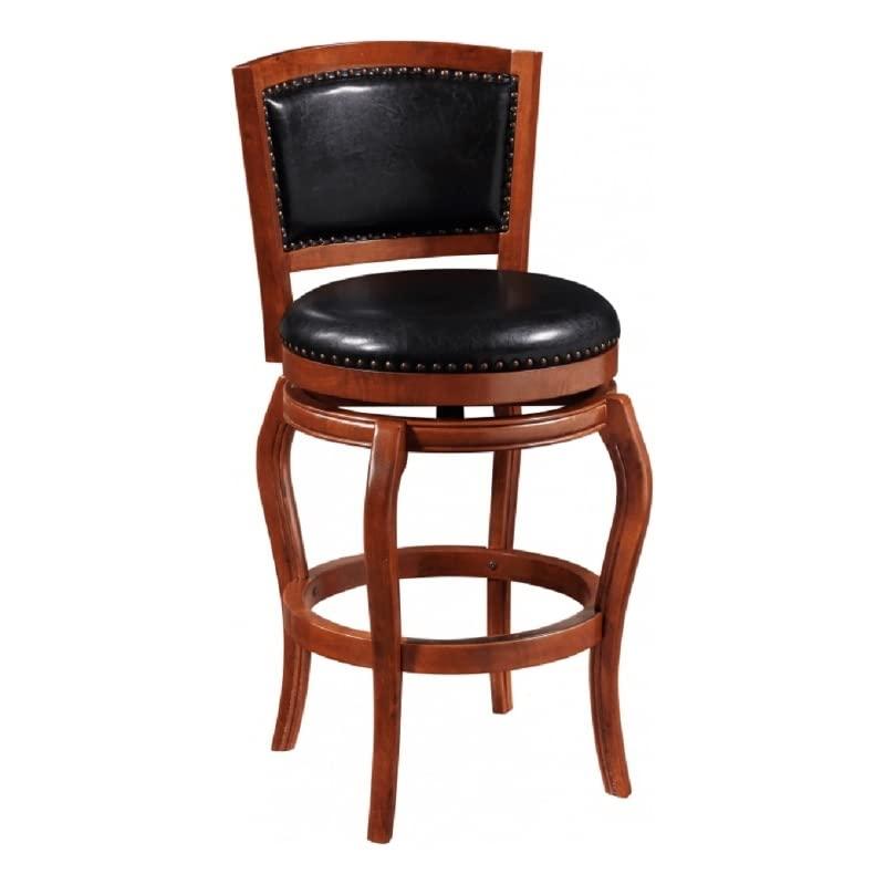 The Harris Swivel Stool knows you take your comfort seriously. Thats why it features an oversized seat (22 inches diameter!) with padded high-density foam cushioning in the seat and backrest. For additional support and comfort, the footrest is built from a solid piece of hardwood with a protective metal kickplate that guards against scuffs and scratches. Genuine brass nailheads provide a traditional accent to the black faux leather upholstery. The Harris is available in three different finishes: Cappuccino, Black, and Cherry. Make this a three-piece set by pairing two barstools with Boraams Florence pub table in a matching color. This stool is recommended for residential use only.