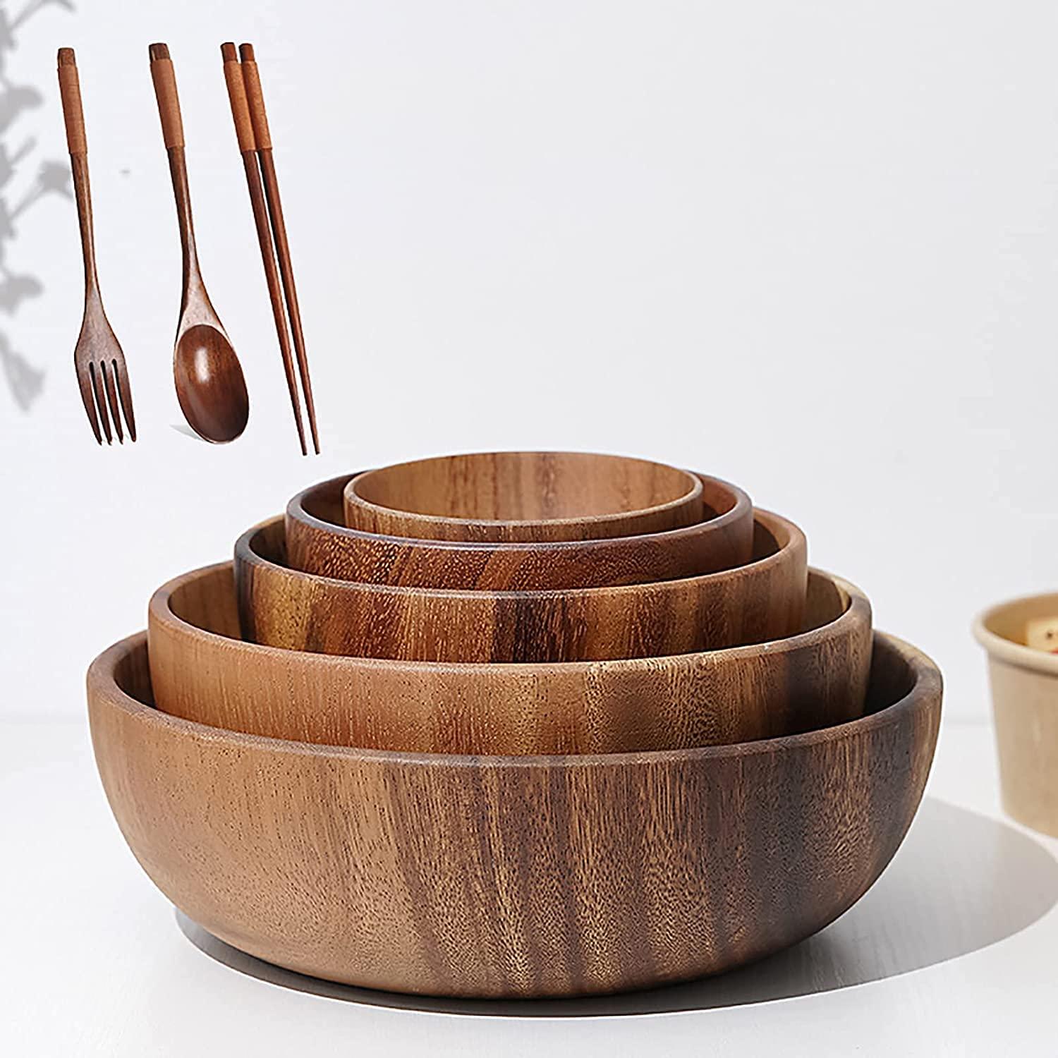 - [AUNIQUE AND NON-STICK] :Wooden bowls set crafted from natural, solid acacia wood, the grain will vary, making each piece unique. They can better protect the tableware, and won't leave any scratches on the pan.
