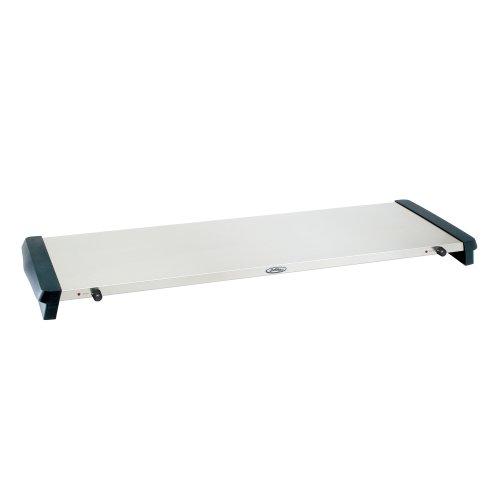 Entertain guests for hours while prepared food stays hot and ready to serve with this commercial-quality jumbo-size stainless-steel warming tray. The unit provides two adjustable thermostats that keep two areas of heat at the perfect temperature (between 155 and 205 degrees F). For added convenience, its stylish cool-touch handles ensure safety during transport. The tray's high-tech stainless-steel warming surface measures 41-1/4 by 14 inches and cleans up in a snap. Other highlights include non-skid feet, 600 watts of warming power, and a safety signal light. Made in the USA, the UL-listed warming tray measures 15-1/4 by 46 by 2-8/9 inches and carries a two-year limited warranty.