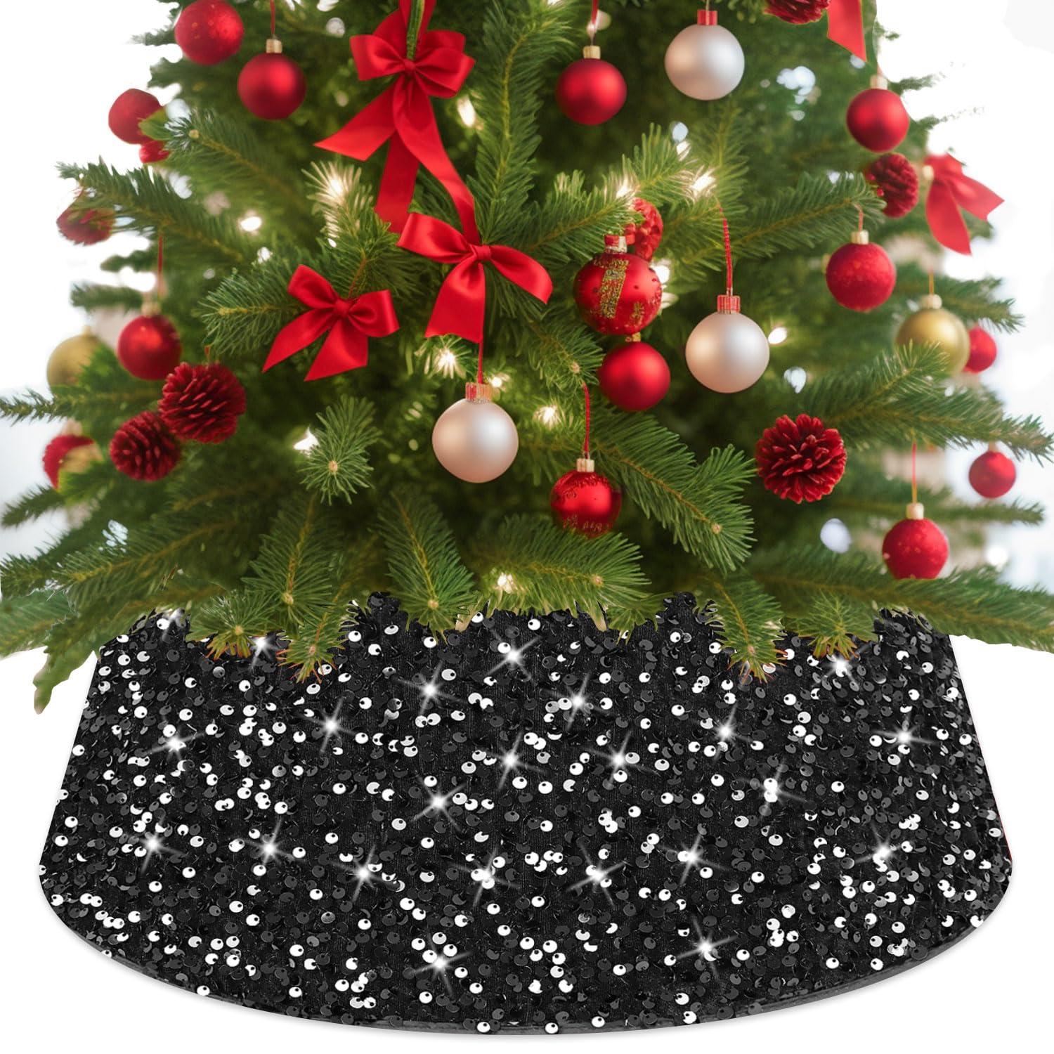 - Sequined Material - Tree Collar BlackThe Sequin tree collar is crafted from quality felt and velvet fabric with sequins, thick and soft, sparkling and sturdy. Capturing light in a stunning way, the slim Christmas tree collar ringadds a dazzling shimmer to your Christmas decorations.