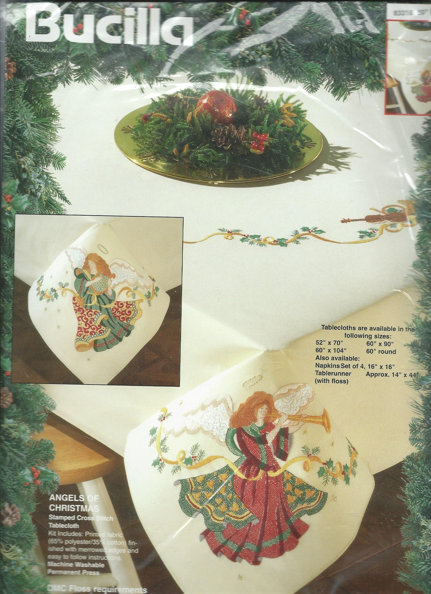 1995 Bucilla Stamped Cross Stitch Kit called "Angels of Christmas". Kit #83318. Beautiful 60" Round Tablecloth. DOES NOT COME WITH FLOSS...but DMC Floss requirements are available on the instructions.