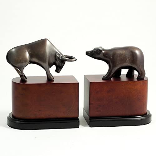 These Wall Street inspired Bull and Bear Bookends are a great centerpiece for the stock broker desk or office. The bull and bear bookends feature the traditional Wall Street symbols clashing in their epic struggle. Each bull and bear bookend features a tarnish proof bronzed brass silver figure mounted on a light maple burl wood base. The stock broker bookends are the sophisticated way to keep books upright and organized in a financial office. For the executive CEO, vice president or the day trader. Excellent, high quality, decorative bookends with a Wall Street theme. Grain burl wood base. Bookends are an excellent stock broker gift. Dimensions: L 7" X W 6" X D 4"