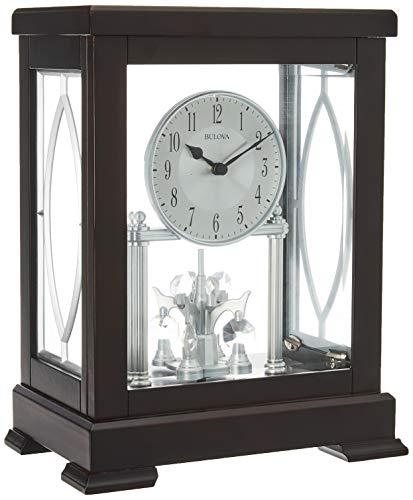 Solid hardwood case, espresso finish. Bevelled glass front. Crystalline revolving pendulum. Two-tone silver polished metal dial. Leaded-glass effect side panels. Requires (2) AA batteries, not included. Engraving plate included: 3 x . 75.