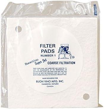 Genuine Buon Vino Super jet filter pads. #1 8. 0 micron nominal filter pads are used for Coarse filtration. They remove large particles in heavy wines, typically big reds. Wine should typically be filtered through #1 pads first, then subsequent runs can use smaller pads If desired.