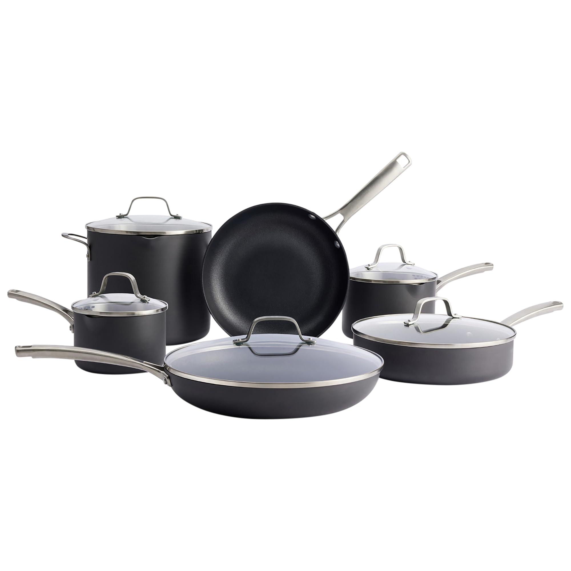 - Designed to save you time in the kitchen, Calphalon Classic Hard-Anodized Nonstick Cookware delivers cooking versatility every step of the way with an improved easy-release surface. - Featuring AquaShield nonstick technology, this cookware line performs like new 40% longer for remarkable food release over and over again. - Convenient measuring marks, straining covers, and pour spouts, allow you to prep and prepare meals efficiently, and stay-cool, silicone comfort-grip handles provide added comfort and heat resistance when you're cooking on the stovetop. - Made with water-based nonstick and a hard-anodized exterior, it's dishwasher-safe for quick cleanup. - This nonstick cookware set is oven-safe up to 450 degrees F, so it can go from the stovetop into the oven for heating. - Elevate your cooking experience with Calphalon Classic, and enjoy exceptional performance with endless possibilities