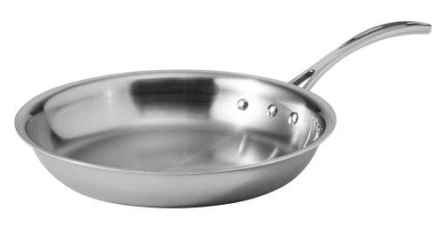 The ideal omelette pan has gently sloping sides and rolled rims so that you can easily flip or slide your omelette. The Triply Stainless 10" omelette is that perfect omelette pan and offers the elegance and beauty of stainless steel with a core of highly conductive aluminum for superior results. The "Cool V" handle diffuses the heat and keeps it comfortable to the touch during normal stovetop use.