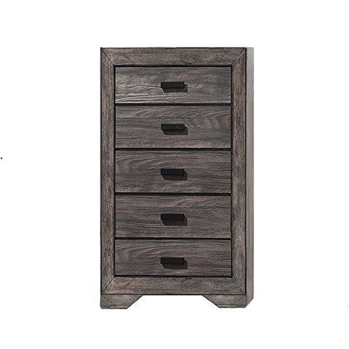 Dressed in a distressed gray oak finish, the handsome Drexel bedroom collection adds warmth and style to any room. Featuring clean lines and modern black finished hardware, this transitional set is sure to impress. Enjoy its stylish wood panel headboard, accented by wood grain and distressing for a warm look. Matching case pieces with spacious storage drawers complete the look of this modern farmhouse inspired collection.