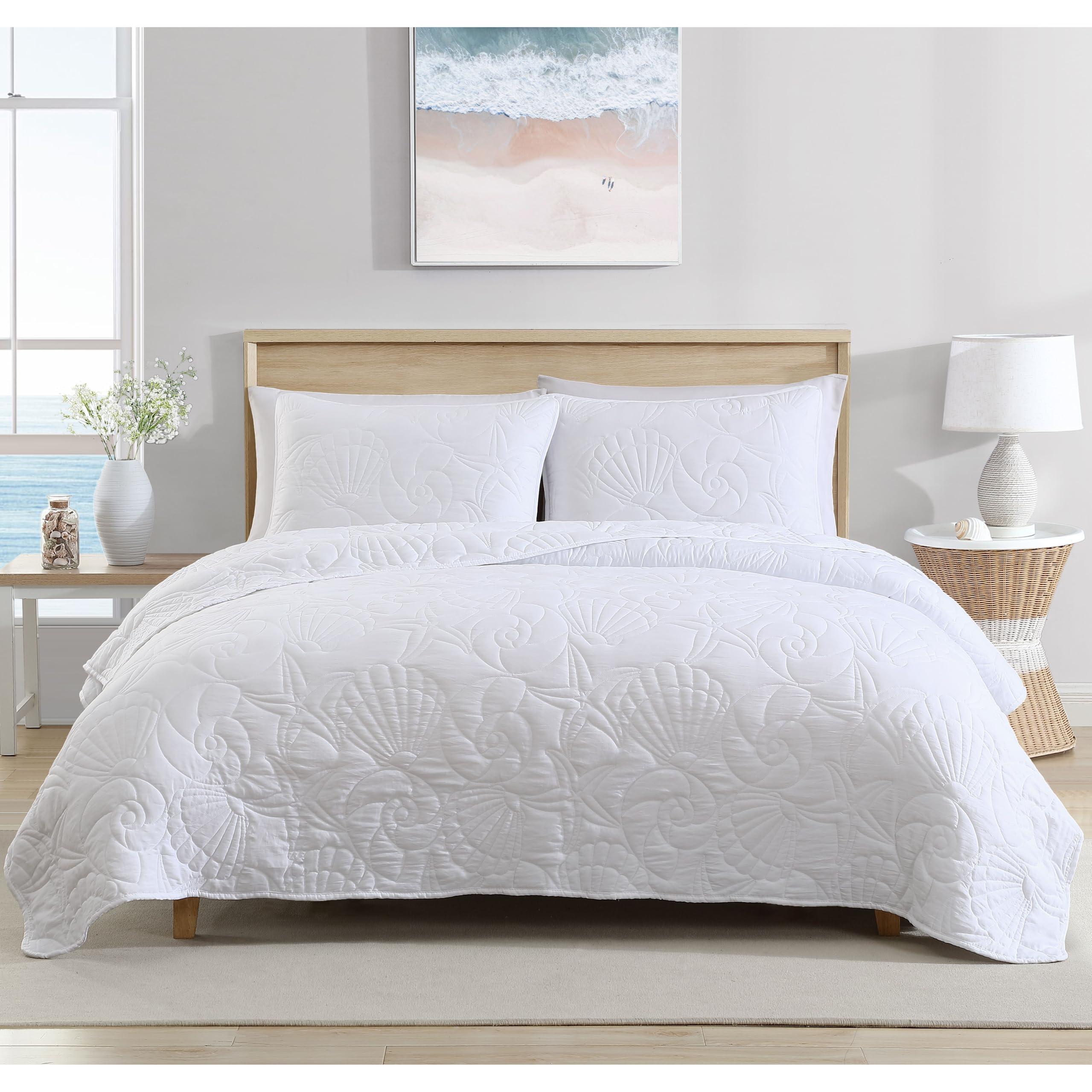 Update your home, beach house, or cottage with the Caribbean Joe Outlined Shell Quilt set. The beach themed quilted design is perfect for coastal living with the subtle themes of shells, sea, and ocean. Great for the bedroom, guest room, Airbnb, or anywhere youd like to feel the gentle waves and breeze of the coast. The Quilt set includes 1 quilt (86"W x 86"L) and 2 pillow shams (20"W x 26"L). Lightweight, soft and cozy polyester is perfect for year-round all-season comfort. Easy care machine washable and dry on low heat.