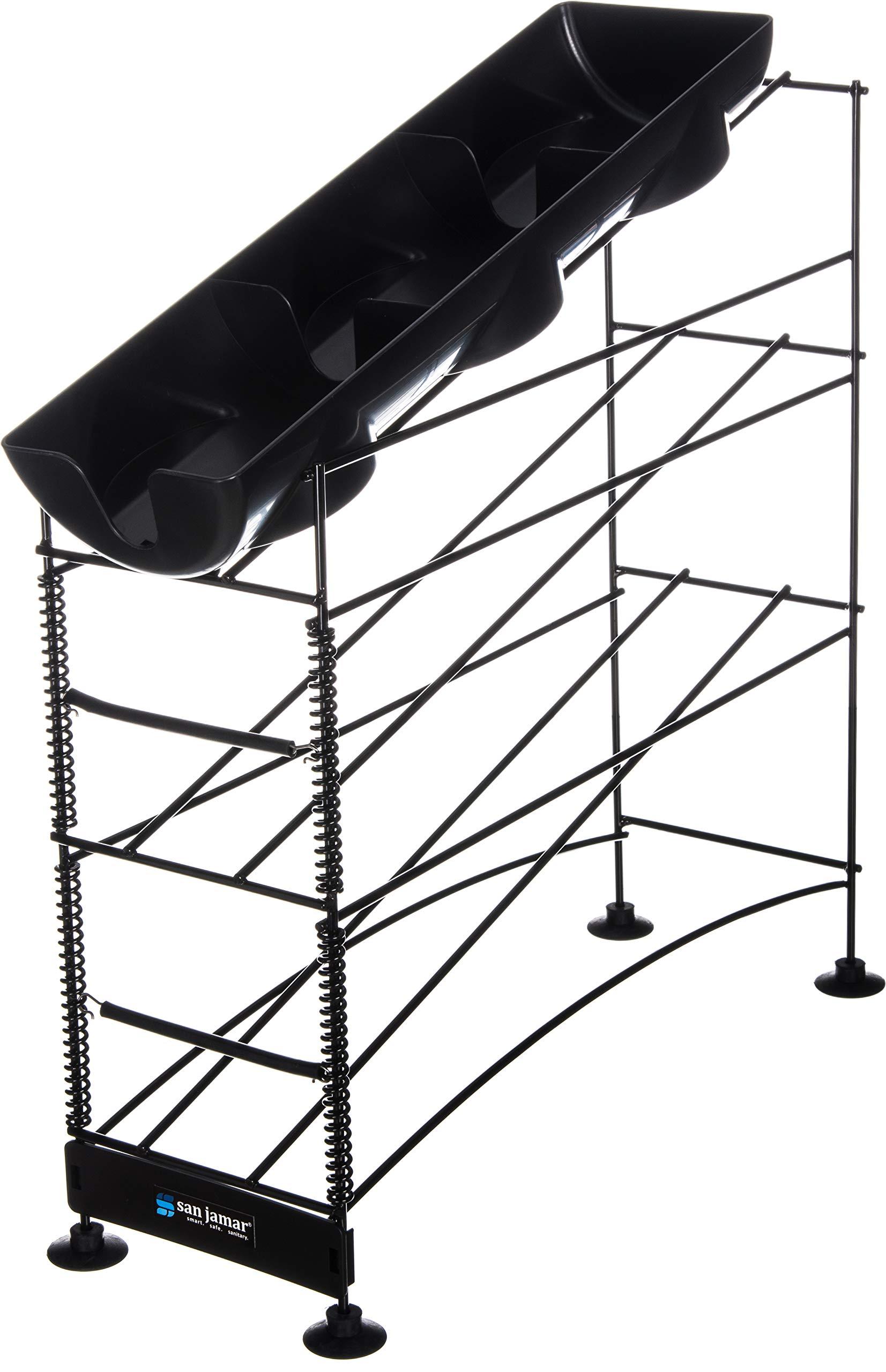 Keep cups and lids organized and easily accessible with the San Jamar Cup and Lid Dispenser. This convenient 4-tier unit neatly dispenses cups ranging from 8-44 oz for efficient self-serve in busy restaurants and food service operations. The adjustable coils easily accommodate paper, plastic or foam cups for versatile use. Dispense anything from small espresso cups to large 44 oz fountain cups. It also works great for lids, letting you consolidate cups and lids in one space-saving unit. Suction cup feet grip the countertop firmly, preventing the dispenser from sliding around during high-traffic use. The easy to use mechanism allows cups or lids to be loaded from the front or back for quick reload on the go. With its organized design, this dispenser saves precious space in food prep areas and beverage stations. The black color and neat 4-tier styling give it an attractive, uniform look. Help keep your kitchen or cafe running smoothly with the San Jamar cup and lid dispenser.
