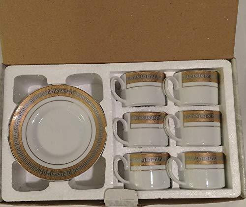 Dress up your next dinner service with this set of 6 espresso cups and saucers designed by Italian designer, M. Valenti. Pattern is Greek key. Pattern is gold and silver tones.
