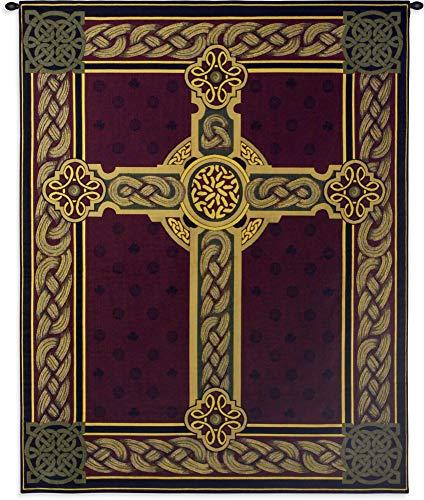 A traditional Celtic cross is the center of attention in this beautiful wall tapestry. The ornate cross is carefully woven from rich greens and soft earth tones while the background is a deep burgundy, a color scheme which generates a brilliant contrast. Finished with a Celtic knot border this majestic piece makes a wonderful gift for anyone of Irish descent.