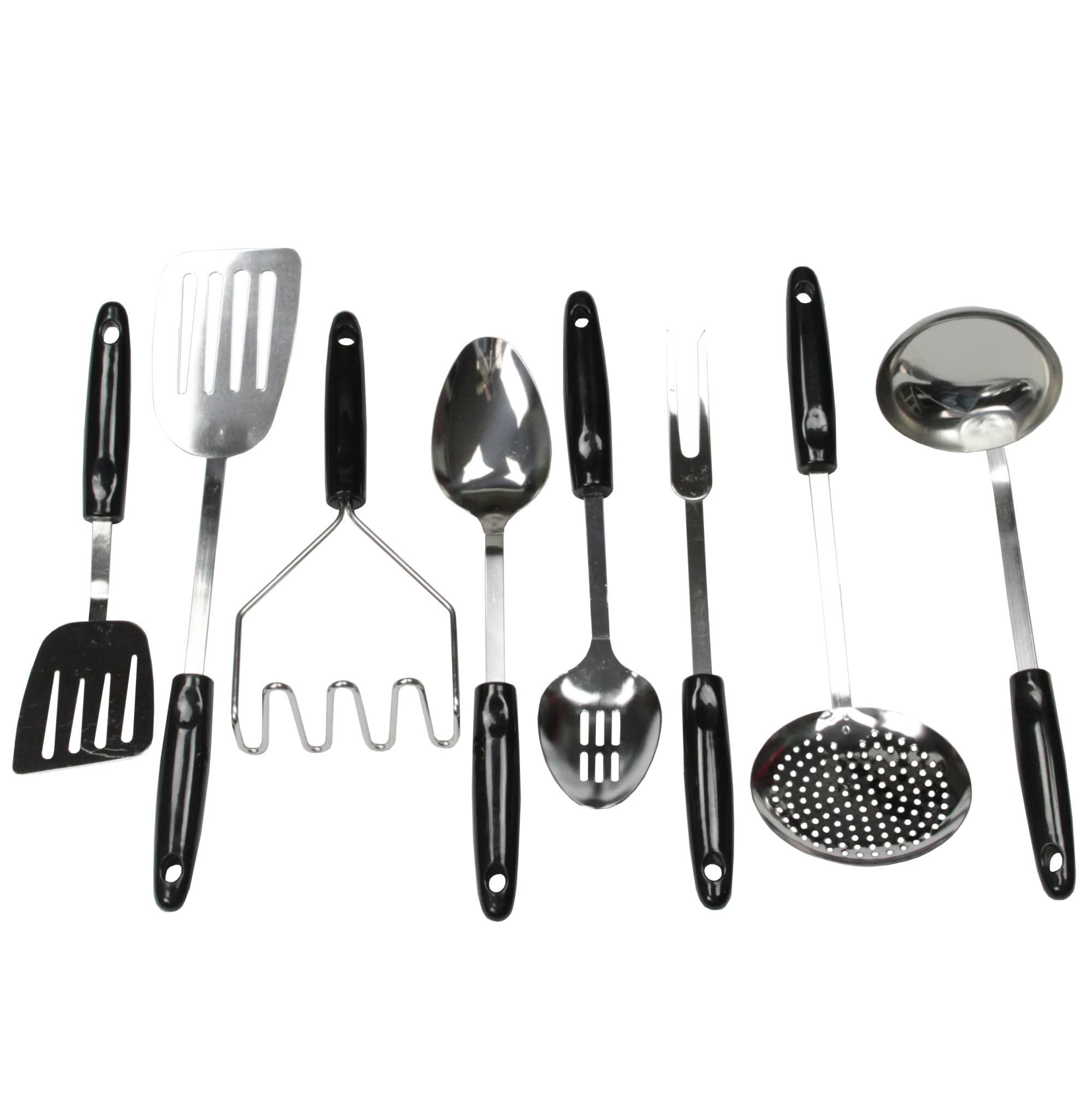 - Includes a slotted turner, a basting spoon, a slotted spoon, a fork, a pancake turner, a masher, and a ladle