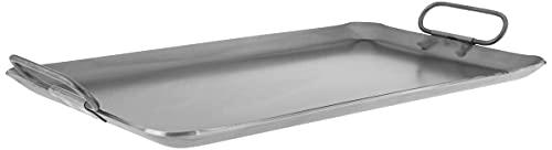 Two Burner Residential, Heavy Duty 10 Gauge Steel Griddle is built to last. Great for Pancakes, Eggs, Heaps of Hash Browns. Cook 10 burgers at once. 3/4" High Lips holds heaps of food, and allow great access. Handy hinged handles get out of your way and make for easy storage. Covers two burners on a standard 30" home range. Works on Gas and Electric. Use it on Barbequers, RV's and Campfires. Comes with easy all natural seasoning instructions. Once cured you will enjoy Stick Free Cooking Forever..
