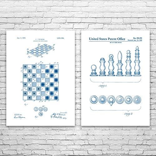 - Set of two 18" x 24" poster prints featuring Chess & Checkers patent illustrations on a Blue & White style background. Designed by Patent Earth, this wall art is made to order and customized with your choice of size and background!