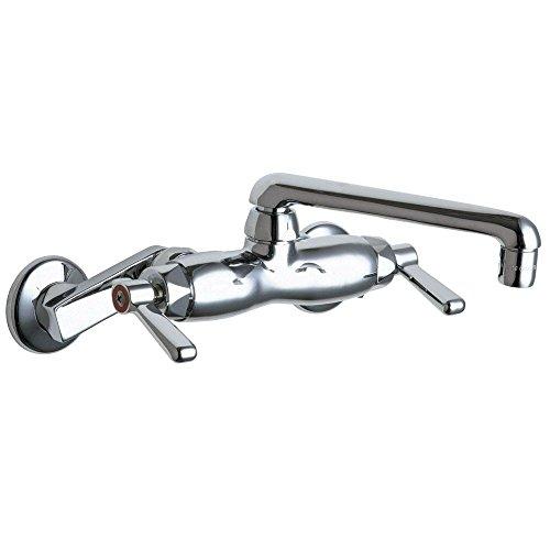 Optimize water efficiency and regulate usage by outfitting your sink with this Chicago Faucets wall-mounted manual sink faucet with adjustable centers and 6" S-type swing spout. Designed with a 6" S-type swing spout, this faucet combines functionality with style. This unit is equipped with a pressure compensating Softflo aerator that releases a soft, non-splashing flow of water at 2.2 GPM. This unit has a rated operating pressure of 20 to 125 PSI and a rated operating temperature of 40 to 140 degrees Fahrenheit for optimal performance. With its durable, cast brass construction and polished chrome finish, this faucet has a total lead content of less than or equal to 0.25% for your safety. It boasts a 3 3/8" body, adjustable arms, and 3" to 8 3/8" adjustable centers that allow it to match the centers on your sink or mounting surface with ease. The hot and cold, vandal-proof 2 3/8" lever-style handles are color-coded for easy identification. Control water flow and prevent leaks with the help of the Quaturn compression operating cartridges. The wall-mounted design is easy to install, and it uses a 2 1/2" offset inlet supply arm. Overall Dimensions: Spout Length: 6" Faucet Height: 2 1/2"