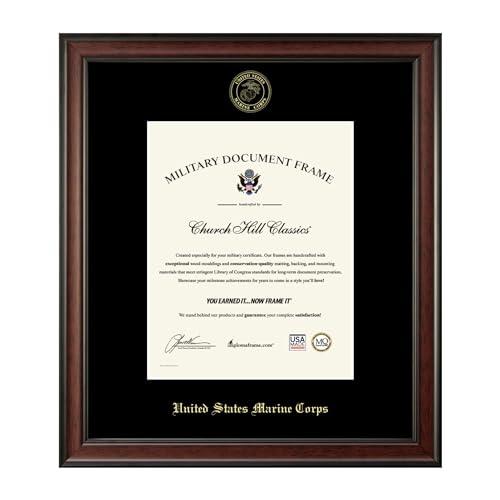 Your USMC certificate deserves the very best display! Whether youre celebrating United States Marine Corps graduation or looking for the perfect USMC gift for a loved one, a Gold Embossed Certificate Frame will keep your United States Marine Corps certificate safe for years to come. This Gold Embossed Certificate Frame features a single black mat with the official United States Marine Corps logo and wordmarks elegantly embossed in gold. Eco-friendly solid hardwood moulding boasts a deep mahogany furniture finish. Our United States Marine Corps certificate frame fits a 8"w x 10"h certificate. The approximate finished frame size is 15.25"w x 17.25"h. It includes UV-glazing protection designed to preserve your USMC certificate. This United States Marine Corps certificate frame comes with a list of helpful instructions and easy-open frame backs to give you professional hanging results every time. Each United States Marine Corps Gold Embossed Certificate Frame is officially licensed and approved by the featured American institution, so you can shop with confidence and Frame What Matters Most.