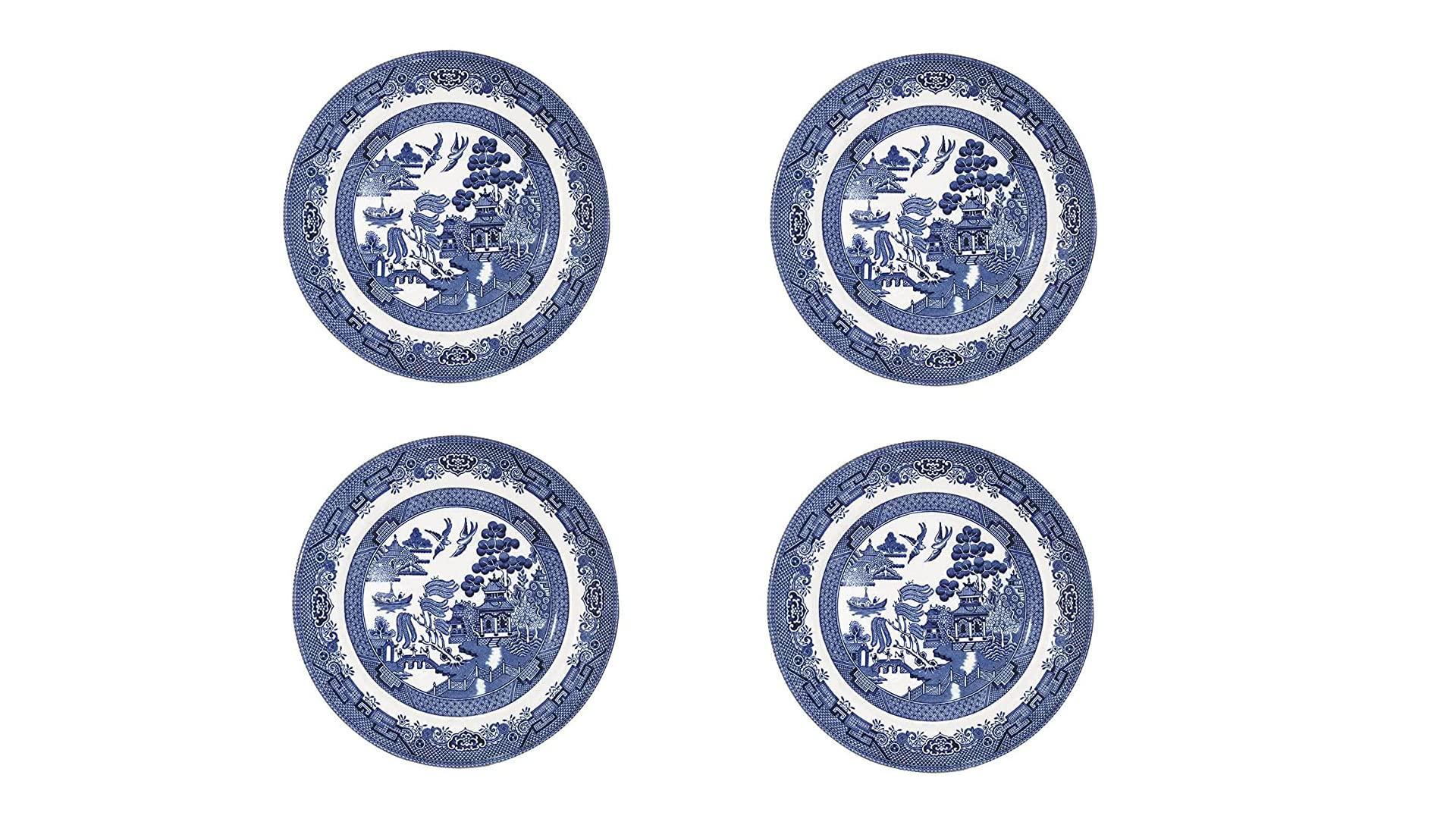 For more than 200 years Churchill Blue Willow has graced the finest tables in the World. It is the worlds most popular pattern in the history of Dinnerware. There is a legend behind this design "Once upon a time there lived a very wealthy mandarin who had a beautiful daughter named Hong Shee, who fell in love with her fathers sectretary, a man named Chang. To keep them apart, the mandarin imprisoned his daughter in the palace. One day she escaped, and the two lovers raced over the bridge to the waiting boat, with the mandarin in pursuit, they managed to elude the mandarin, reach the boat, and sail away. A storm developed, the boat foundered and the couple were lost at sea. It is said that the two love birds appeared immediately after-the spirits of Hong Shee and Chang." To represent elements of the legend, traditional Willow has several prominent features a tea house with a pavilion on the right. An Orange tree stands behind. A willow tree dominates the centre. In front of the willow is a bridge with three people. A boat with a person in it appears top left with another building and tree. And of course the two love birds face each other at the top.You today can enjoy the history by using Willow in a formal or casual setting. This vintage feel is applied to the Four 10" Dinner plates in the set for 4. Manufactured in fine English Earthenware, Blue Willow Dinnerware products are both Microwave & Dishwasher safe. This collection is endorsed by Churchill China with its 200 years of history in the manufacture of dinnerware for the home.