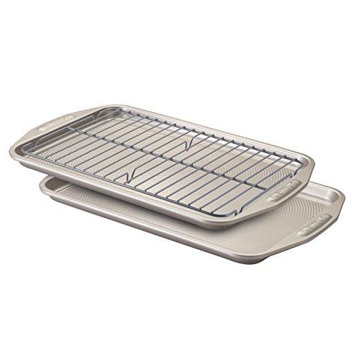 Transform the kitchen into a high-efficiency baking center with the Circulon Nonstick Bakeware 3-Piece Bakeware Set. This practical set includes two 10-inch x 15-inch nonstick cookie pans and a cooling rack, so its easier than ever to bake cookies, and cool them while prepping a second. Heavy-duty carbon steel construction provides uniform heat distribution, and rolled edges on the cookie pans offer extra strength with long-lasting warp resistance. The TOTAL Food Release System on the bakeware interiors combines raised circles and premium-quality nonstick for a surface that is metal utensil safe and easy to clean, with exceptional performance. Wide handles on the bakeware provide a confident grip, and the baking pans are oven safe to 450F. Combine this baking set with other items from the Circulon collection to further enhance your cooking and baking solutions. Bake homemade treats quickly and efficiently with the convenient Circulon Nonstick Bakeware 3-Piece Bakeware Set.
