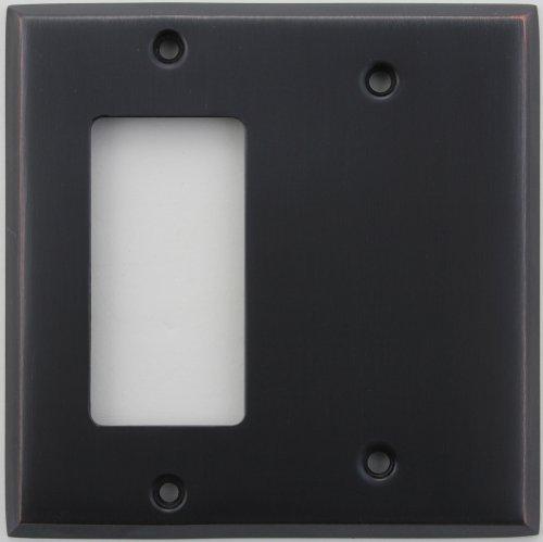 This plate is made from stamped steel that is copper plated then finished to beautiful oil rubbed bronze finish with some of the copper undertones showing through. This plate differs slighted from our forged brass oil rubbed bronze finish, first by material used in its construction (copper plated stamped steel versus copper plated forged brass), thickness (it is thinner than our forged brass counterpart), and tone (the finish on the steel plate is slightly darker and a little more gray in color than the forged brass version). This two gang combination wall plate will accommodate one standard GFI electrical outlet, rocker light switch or any other rocker opening device and one blank position. The plate measures 4 5/8" by 4 5/8".