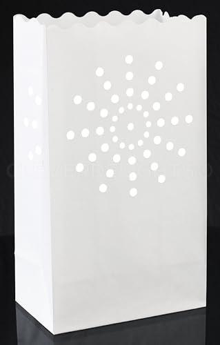 CleverDelights white sunburst luminary bags. 20 pack. Dimensions: 10" high x 6" wide x 3.5" deep. Works great with battery operated LED tealight candles (no tealights included). For indoor or outdoor use. Made from flame-resistant paper. Perfect for Christmas decorations, wedding receptions, parties, and holiday decor. Tip for outdoor use: Add a small amount of sand or rocks to the bottom of each sack so it doesn't tip over in the wind. Shine some light on your next event with these beautiful luminarias. Please visit our store for our full selection of luminary bag styles and colors.