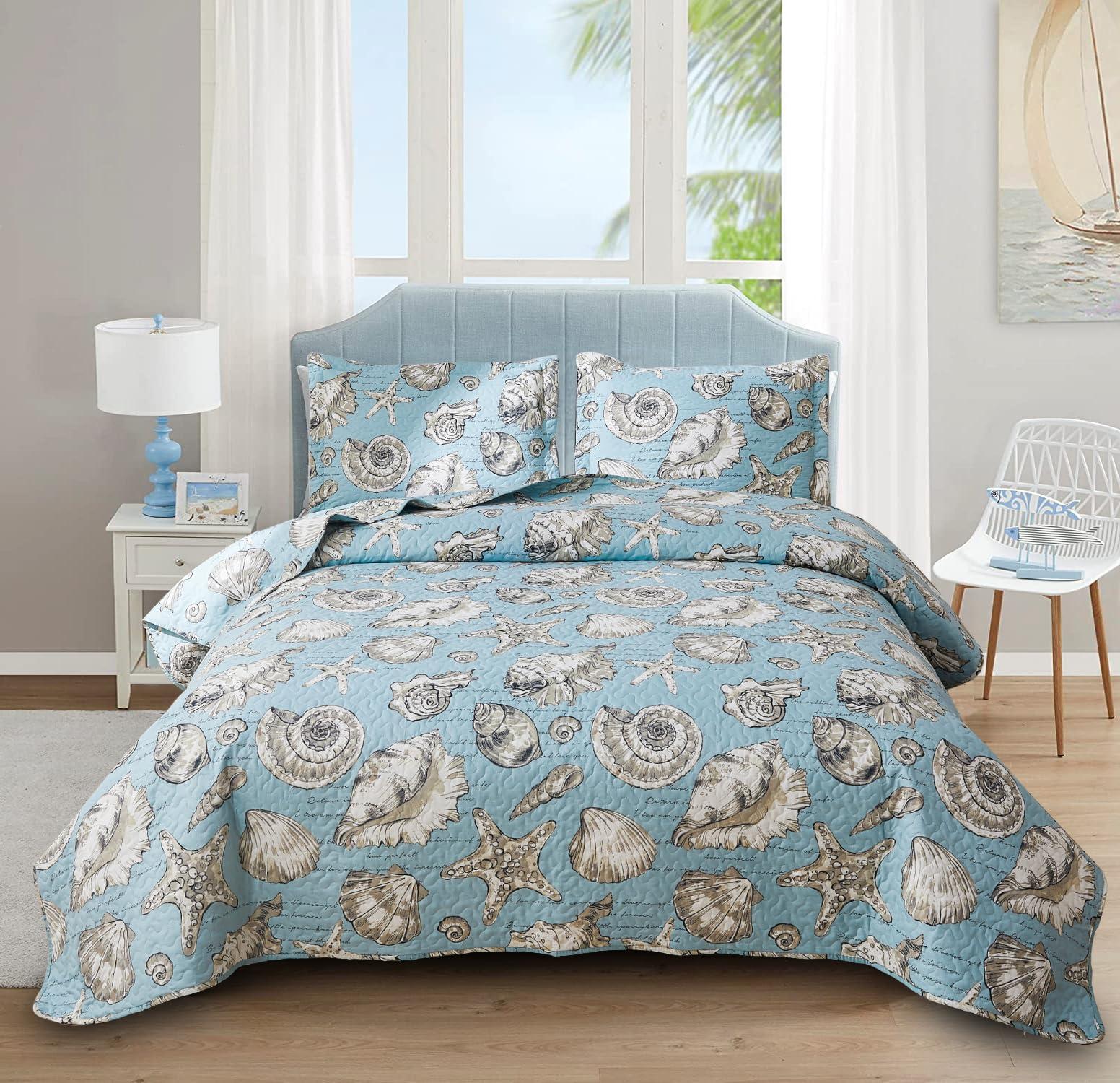- Summer Seashell BedspreadsBlue white ocean themed shell conch starfish coral printed bedspread,fresh ocean element collocation with comfortable tonal,bring a relaxed and comfortable seaside holiday mood to the bedroom. Whichever sides you choose to use will bring a relaxed and comfortable seaside holiday mood to your bedroom.Perfect for any apartment,cabin,lake house,coastal house,cottage,or lodge decor.