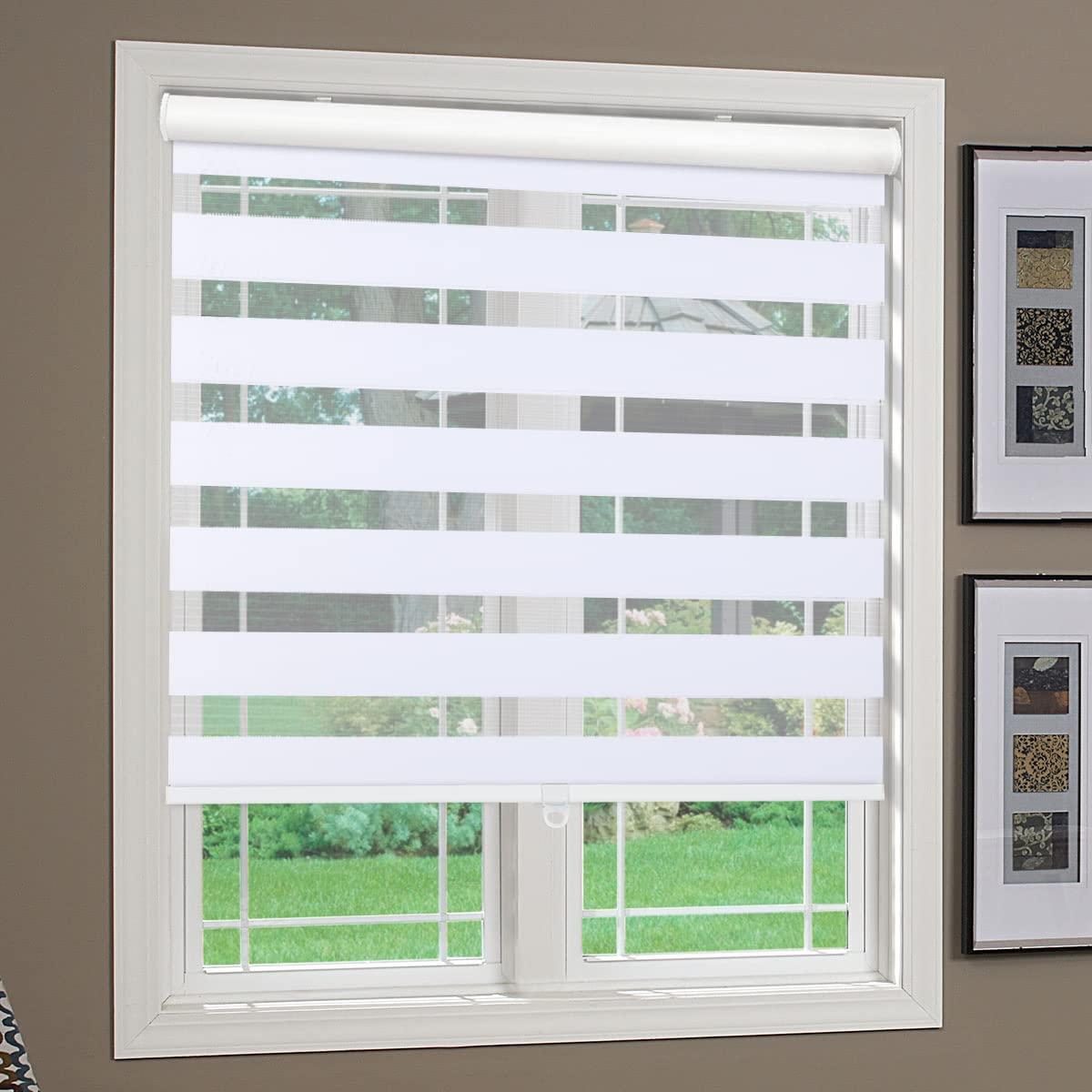 - [Excellent Material & Double Layer Fabric] 100% ployester. Our zebra shades is combination of soft sheer and solid fabric in horizontal zebra stripes. Compare with venetian blinds/shutter, zebra roller blinds is not only can easily to control the lights by interlacing and overlapping two layers of fabric, but will be more comfortable and beautiful. It's an ideal choice to privacy blocking and lights control.