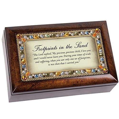 Cottage Garden inspirational and sentimental products are both lovely and classic in style. Be encouraged by a message that reads, "Footprints in the sand. The Lord replied, my precious, precious child, I love you and would never leave you. During your times of trial and suffering, when you saw only one set of footprints, it was then that I carried you." Designed by artists in the Heartland of America, Cottage Gardens Collections reach a variety of tastes and have a wide range of occasions for gifting. Woodgrain finish gives this music box a class look. Lovely beaded jewel details frame the hinged lid. Measures approximately 6 x 4 x 2.5 inches; Replace artwork with 4 x 2 inch personal photo. Traditional wind-up mechanism engages music to play melodic tune On Eagles Wings. Black velvet lined interior cushions your precious treasures; Decorative bun feet are padded to protect table top and shelf surfaces. Ships in protective packaging; Ready for giving to that special someone.