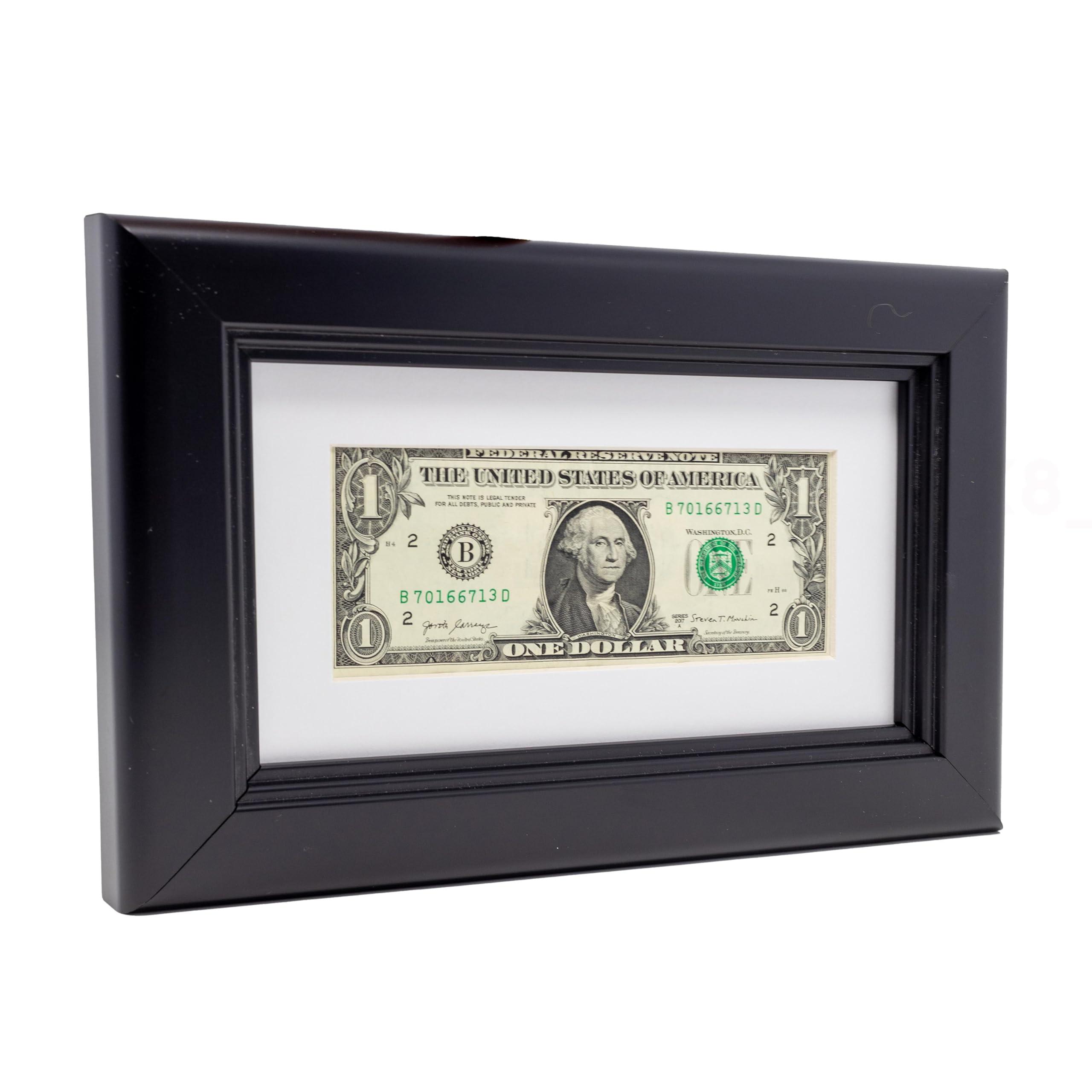 Traditional Black solid wood frame to hold any US currency. Features a high-quality traditional black real wood moulding, UV-resistant acrylic front, acid-free white matacid-free foam board backing and hanging hardware. Made to display 2.61 x 6.14 dollar bill with the white mat or 4.5" x 8" without the mat. Frame moulding is 1.5" wide and frame rabbet is 0.5" deep. The overall frame size is 7.5" x 11". Easel stand and wall hanging hardware are included with this frame for a versatile display. Hang your dollar bill frame on the wall or display on a tabletop. This dollar bill holder is ideal for beginners or experienced collectors, or business owners alike. It can be a thoughtful present or a useful addition to your personal collection or place of business. Our dollar bill frames are made in the USA. At Country Art House, we make, package and ship each frame with care. Satisfaction guaranteed!