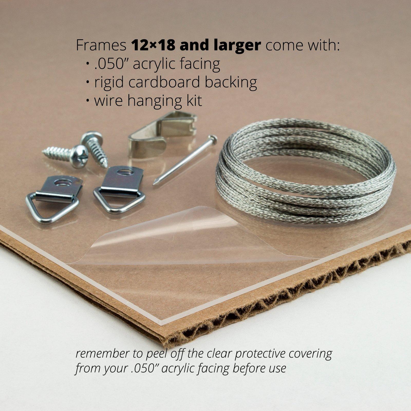 - Frame includes: acrylic facing, cardboard backing and wire hanging kit (assembly required)