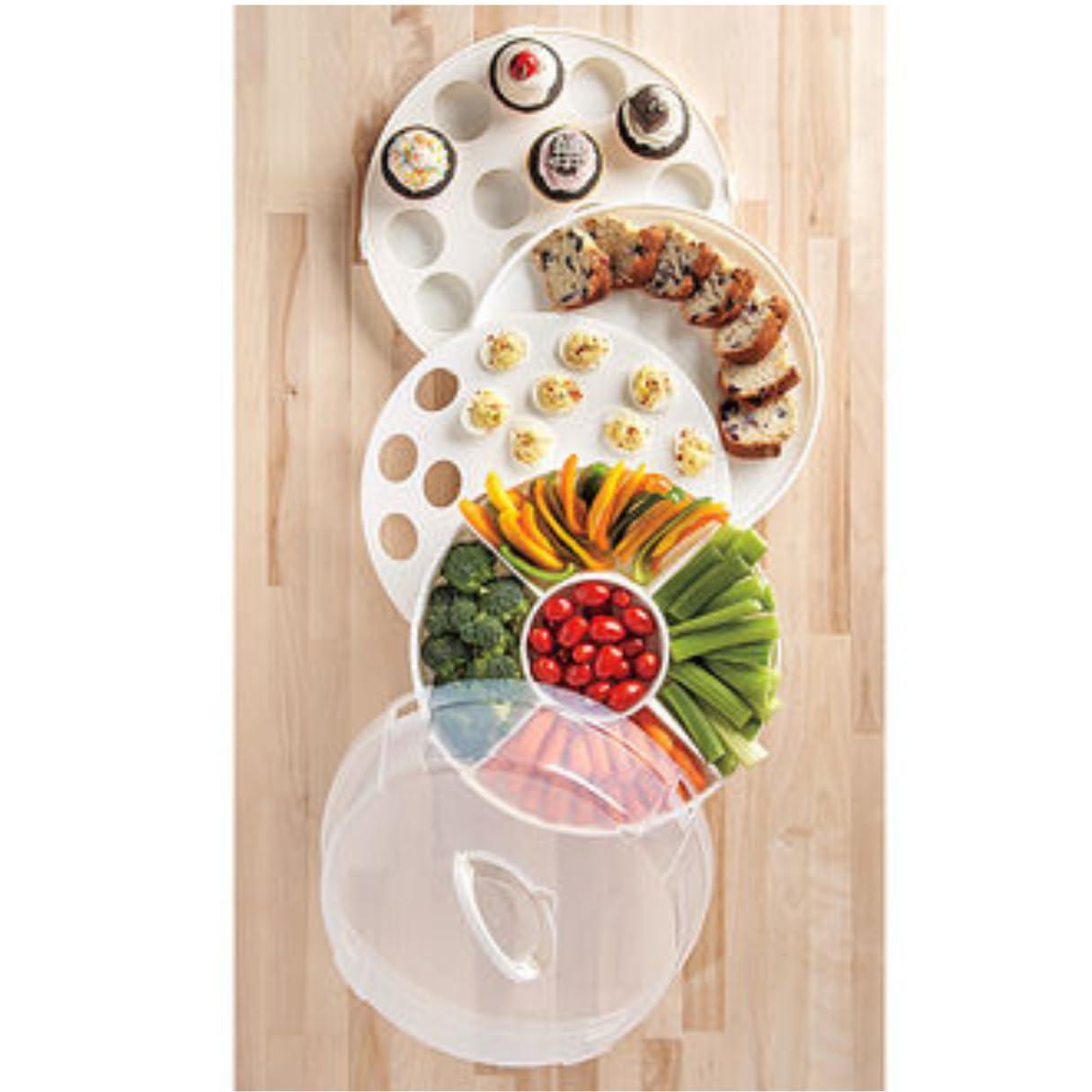 - Everyday Party Platter: The round carrier is perfect when it comes to traveling with your cupcakes, pies, round cakes, cookies, brownies, muffins, pastries, deviled eggs, veggie dips and more. Its a Party on The Go!! Deep Cutouts for your Easter Cupcakes or Muffins to sit in to keep them sturdy in place.
