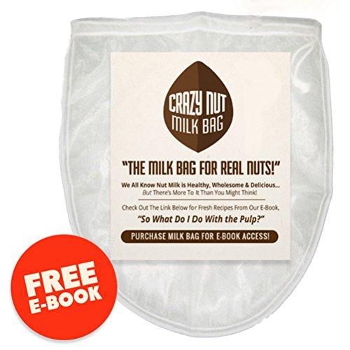 The Crazy Nut Milk Bag is made from 200 micron fine mesh which is the finest food grade filtering mesh available so pulp doesnt end up in the milk. The nut milk bag is large enough (9 inches wide by 12.5 inches long) so it fits over the top of virtually all blenders for a clean pour into a pitcher or bowl. Other design features include an ergonomic bias cut design with strong single draw cord so the bag is easy to pull closed and squeeze. The bag has durable stretch stitch seams which are external and easy to clean. The bag is quick drying for healthy reuse. Main uses of the nut milk bag include nut milk making, juicing with a blender, sprouting seeds, cheese fermenting and sprout and buckwheat rinsing. Pulp from all nut milks can be put to use in many ways including dips, pancake batter, freezer fudge, smoothies and much more. E-book entitled So What Do I Do with The Pulp? is included with each purchase of the Crazy Nut Milk Bag. Limited lifetime warranty included.