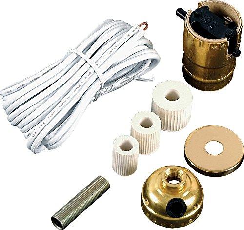 Wholesale Pack of 10 Bottle Lamp Kits - DIY easily convert your treasured wine or decorative bottles into unique, convenient electric accent lamps or repair and restore an old lamp. These unique and charming Bottle Lamp Kits allow you to easily convert your treasured wine, brandy, or decorative bottles into unique, convenient electric accent lamps. Each kit comes with 3 different size rubber adapters to fit the finished socket assembly in to the bottle opening. Adapters are (1/2", 3/4" and 15/16" diameter size), to fit different size wine bottle necks. All necessary hardware parts and instructions are also included. With these kits you can create a clever lamp in minutes. 8 Foot White SPT-1 Lamp Cord with factory assembled plug included. Push Thru style socket includes a socket cap with a side hole so glass bottle does not need to be drilled as lamp wire can exit the socket from the side of the socket cap (and not run through the bottle). If desired the lamp can also be wired by passing the lamp wire up through the bottle and through the threaded nipple and into the socket for a more finished look. Cord set & fittings. UL Listed. 75 watt max household bulb recommended.