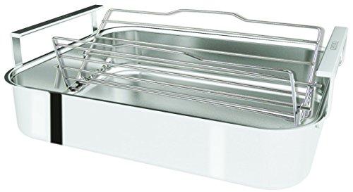 Its dimensions are perfect to be able to fit a conventional oven thanks to its non-overflowing handles. Its riveted handles run the width of the vessel to allow easy access without risk of burning even with potholders.Dimensions: Width:16 Depth: 13 Height:3The 3-ply roaster is realized with stainless steel / aluminum / stainless steel thick, the bottom can also be used on an induction cooktop.Equipped with an adjustable and foldable stainless steel rack for a space-saving storage, but also for use in horizontal position (steaming fish, beef sizes, rack of lamb, etc.) 3-ply Roaster by Cristel: Stainless steel 18/10 shiny finish Stainless steel 18/10 3-Ply construction Compatible with all burners including induction Oven proof and dishwasher safe including lid Made in France