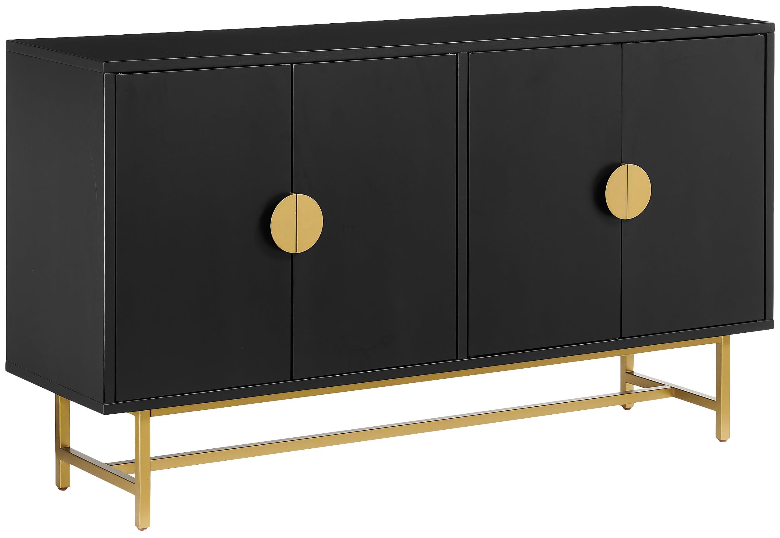 - Features gold legs with adjustable levelers and cabinet doors with magnetic closures