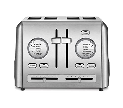 Function and fashion come together to deliver the best in style and performance. These sleek, stainless steel Cuisinart toasters are designed to accommodate all types of bread selections and shade preferences. High-lift carriages, generous slots and precision settings, make these the toasters everyone will want to trade up to! Features: Toast options: Bread Bagel English Muffin Frozen Waffle and Pastry|Unique Single Slice Function allows for even toasting side to side|4-slot version|1 1/2" wide toasting slots|Crisp modern design|Slide-out crumb tray|7 Shade settings|High lift carriage|Defrost option|Limited 3 year warranty|BPA free