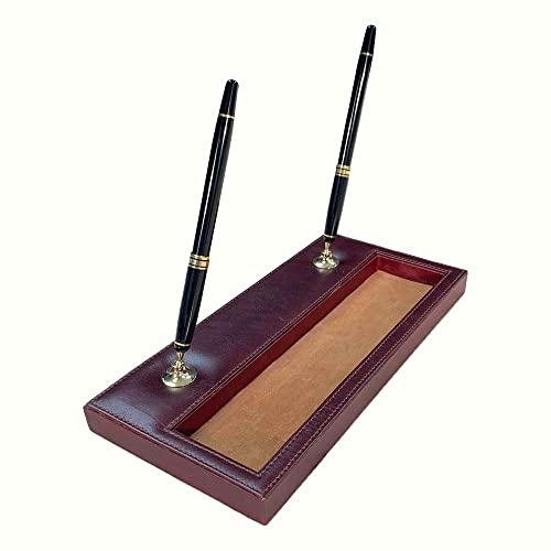 Make a statement in your office with this beautiful leather pen stand! Made in a gorgeous mocha top-grain leather, this durable and gorgeous unit adds an element of luxury and permanence to any office. Hand built with the finest materials, this pen stand comes complete with 2 gold-accented rolling ball pens with black ink cartridges. With a felt lining and a handy storage cubby, the finished, luxury feel of this piece can't be denied. Improve your desk today with the smart function and luxury style of this gorgeous pen stand!