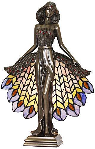 Both functional accent lamp and illuminated sculpture, our Luna Sculpture Accent Lamp will add grace and charm to any decor. The lovely illuminated statuette depicts the figure of an Art Deco era woman standing gracefully. She holds her skirt, which is actually the lamps shade, crafted in art glass to resemble a beautiful array of feathers in light and dark amber. The bottom fringe is accented with iridescent glass, which surrounds amber art glass gems for texture and sparkle. The base is the womans body that has been meticulously cast to capture every detail of her lovely face, dress, and stepped platform, all finished in Antique Bronze. A perfect piece for a mantle or curio shelf, our Luna Sculpture Accent Lamp also makes the perfect gift for any occasion.