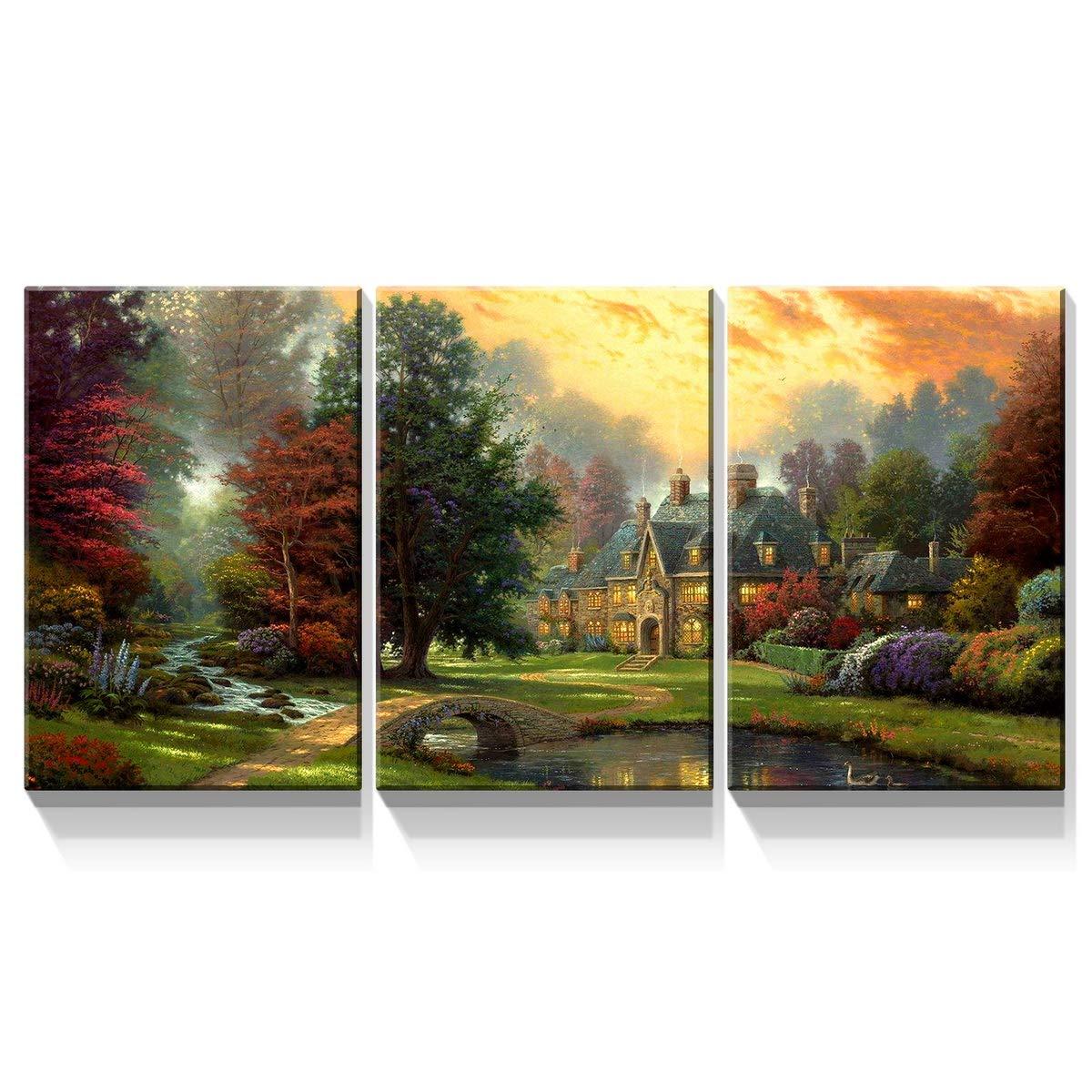 Denozer - 3 Panels Canvas Wall Art Thomas Kinkade Garden Landscape Oil Painting for Home Decor Stretched and Framed Ready to Hang - 18"x24"x3 Panels Wall Decor