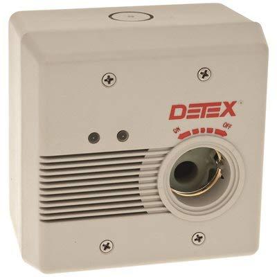 DETEX Detex EAX-2500 surface mount exit alarm Detex Exit Alarm EAX-2500 The Detex EAX-2500 is designed for applications that require a 9VDC battery or external AC/DC powered alarmed exit device on secured doors. The alarm, with approximately 100dB, will sound when someone attempts an unauthorized exit. The EAX-2500, with it's smaller size and designed to fit in a standard 4"x4" outlet box makes it the choice for quick and easy installations on emergency exit and restricted doors. *No cylinders are included with this unit. A mortise cylinder is required to use this lock from inside. If you want to operate this lock from outside the door you will need to purchase a rim cylinder too.* Features and Benefits: Low-cost, door alarm with piezo horn that sounds to warn unauthorized use of a door. Surface and flush mount available. Easy to install using ordinary tools. Fits into a standard 4"x4" double switch/outlet box for both surface and flush installations. Now available with field selectable options. Available in gray and black. Patented cam assembly automatically adjusts for different sizes of cylinders without the use of spacers. Mortise cylinder required with standard Yale cam for Inside Key Control. Alarm can only be silenced by proper control key. Modern graphics on cover to demonstrate key rotation and operation. Improved electronic circuits for longer battery life, LED functions. 9VDC battery powered with optional AC/DC external power. Tamper switch monitors cover manipulation. Tamper resistant housing and cover protects electronics and battery from manipulation. Extended bypass, now a standard feature, allows alarm to remain bypassed when door is open and automatically rearm upon door closing. Custom settings may be ordered and programmed at the factory. Upgraded features are now included and field selectable. Packaging Features The EAX-2500 package includes: EAX-2500 Exit Alarm Peel & stick door sign Key Stop (f
