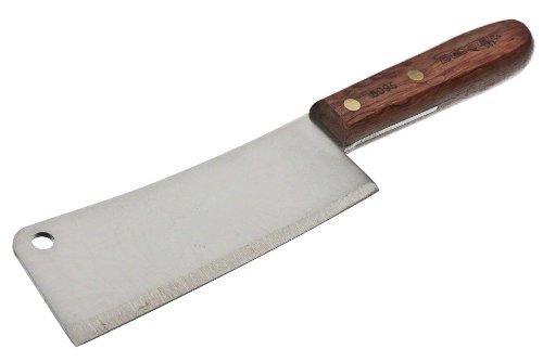 This cleaver has a high-carbon hand sharpened and honed steel blade with hanging hole at the end. The rosewood handle is secured to the blade tang with brass rivets.