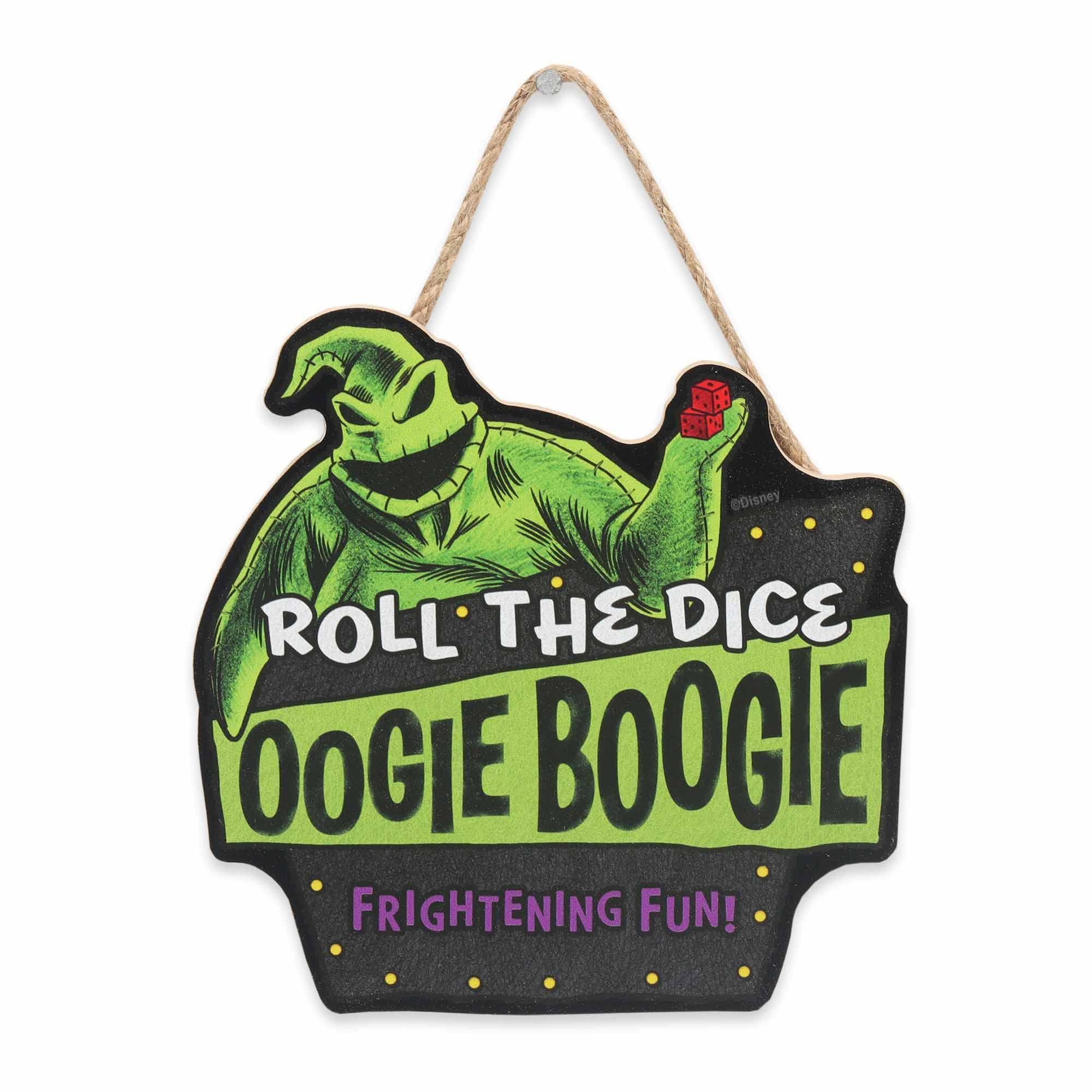 - Fun Vintage Sign: With a lime green, black, and purple color palette, a depiction of Oogie Boogie holding a pair of dice, and the words, "Roll the Dice," "Oogie Boogie," and, "Frightening Fun!," this sign makes an excellent gift for fans of all ages.