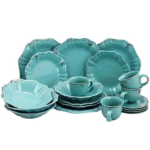 - A STUNNING ACCENT TO YOUR TABLE The Elama Fleur De Lys 16 Piece Round Stoneware Dinnerware Set in Turquoise