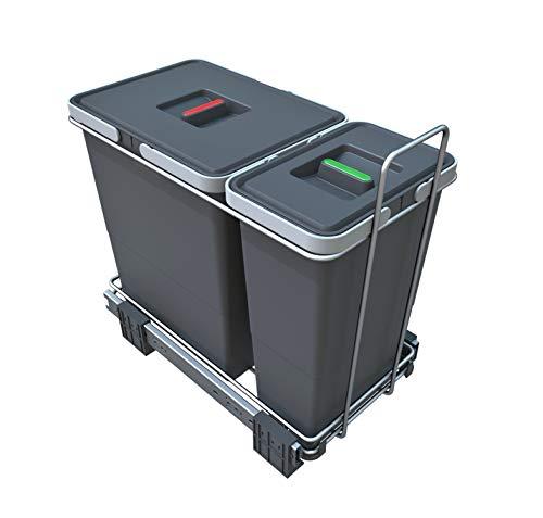Recycling bin made of steel wire and plastic. Completely removable with metal runners. An extremely simple and sturdy range of rubbish bins designed to last for years and for maximum versatility due to its space-saving design. There are containers inside (all with lids) providing separate compartments of 18 + 8 litres. Made to fit inside your kitchen units with quick and easy mounting using 5 self-drilling screws (included).