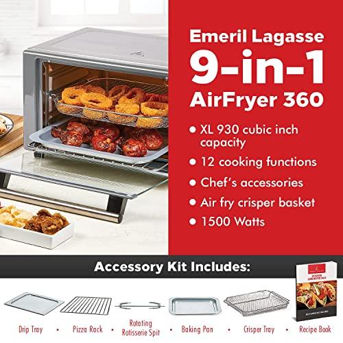 - STAINLESS STEEL CONSTRUCTION: A sleek, state-of-the art appliance to complement your kitchen and surrounding accessories, This All-in-One air fryer, rotisserie, and Dehydrator oven provides long-lasting versatility and an XL 930 cubic inch capacity. Includes a crisper tray, rotisserie spit, pizza rack, baking pan, drip tray, and cook book with recipes written by Emeril himself!