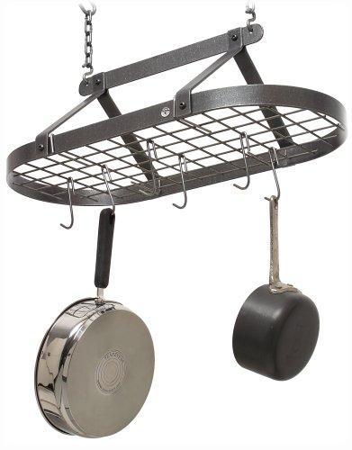 - Get pots and pans out of the cabinet and up on the ceiling where you can easily reach them when cooking; pot rack has a scrolled designed oval shape that adds a rustic feel