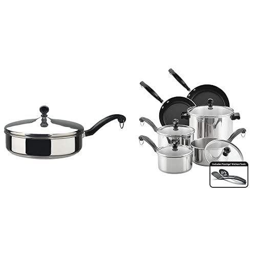 This Farberware Classic Series Stainless Steel Saut Pan with Lid goes instantly from cooking a fast breakfast in the morning to preparing family frypan meals at night. Farberware has been trusted for over 100 years, and this frying pan continues that tradition for a new generation. A full cap base featuring a thick aluminum core surrounded by stainless steel provides rapid, even heating, whether basting eggs or sauting zucchini and squash. The frying pan is constructed of heavy-duty stainless steel polished to a mirror finish for a classic touch, and the comfortable handle with iconic styling provides a confident grasp. This pan works perfectly for making a weeknight dinner of Sloppy Joes or caramelizing onions and peppers with Italian sausage. A self-basting lid helps seal in heat and flavor, and the fry pan is dishwasher safe and oven safe to 350F. Cooks who love the versatility and durability of other pots and pans from Farberware will find all kinds of uses for this big frying pan with lid. Prepare tried-and-true family favorites and create enticing new dishes with this Farberware Classic Series Stainless Steel 2.75-Quart Saut Pan with Lid.