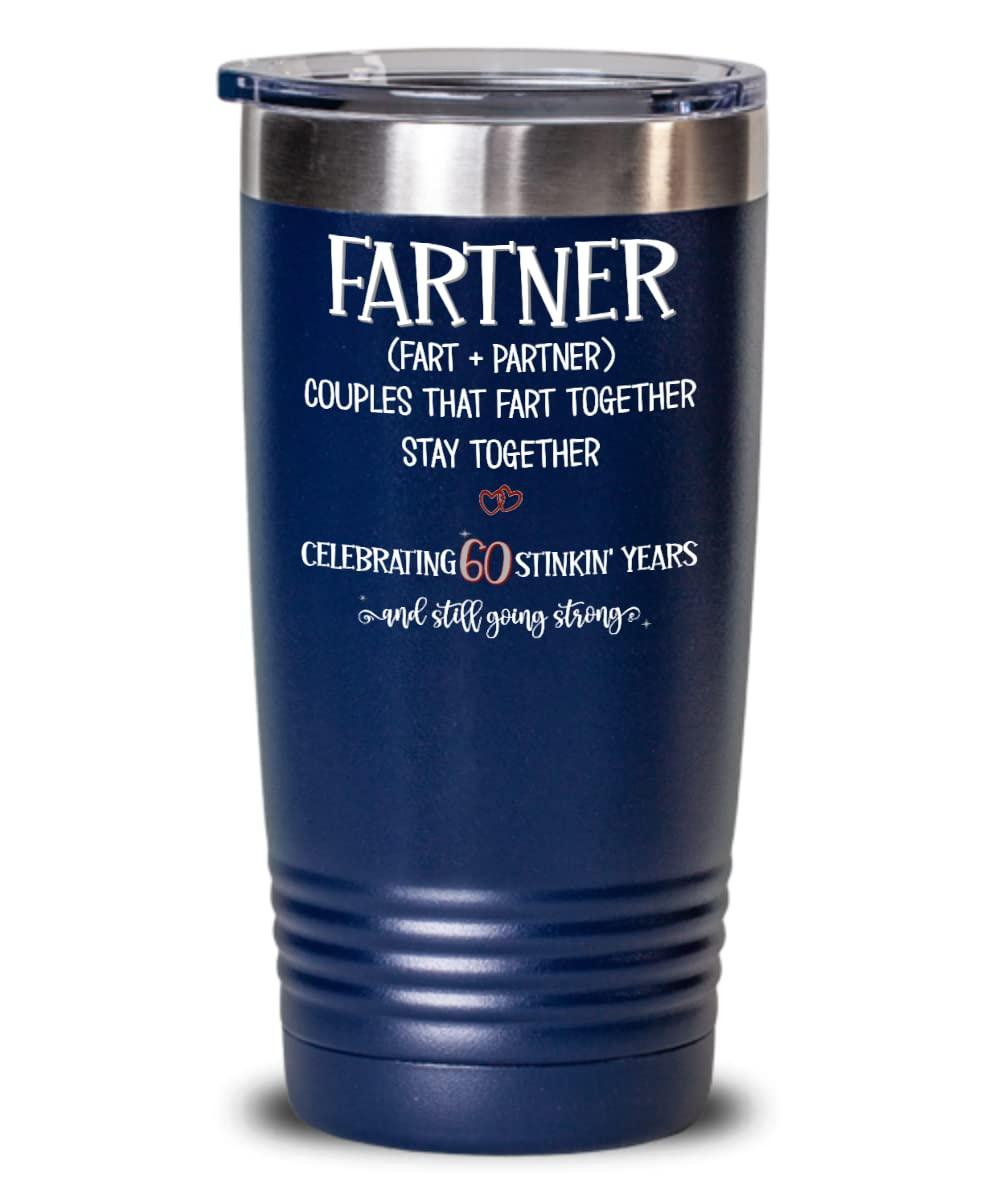 Fartner 60 Years Tumbler 60th Anniversary Ideas Fart Partner Husband Wife Parents Dad Mom Funny Sixty Yr Marriage Wedding 20 or 30oz Powder Coated Cof