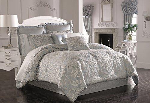 Add a stylish elegance that will radiate throughout your room with the Five Queens Court Faith 4 piece comforter set. An on-trend soft blue hue is seen throughout the Faith bedding collection, which adds just the right amount of modern glamour, warmth, and luxurious comfort to your bed. All constructed in a puff-textured microfiber polyester fabrication, the Faith comforter and pillow shams will surely make the perfect finishing touch to your bed set. This set includes a comforter, 2 pillow shams, and bed skirt. Dimensions: Queen Comforter 92 x 96, Bedskirt 60 x 82 x 15, Shams 20 x 26. King Comforter 110 x 96, Bedskirt: 79 x 82 x 15, Shams: 20 x 36. California King Comforter 110 x 96, Bedskirt: 72 x 86 x 15, Shams: 20 x 36. Decorative pillows and window treatments complete the look and are sold separately.