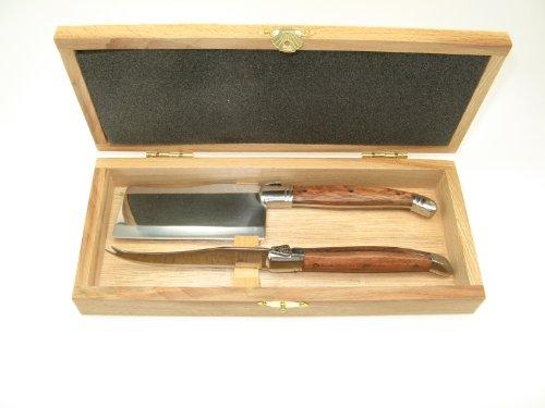 Classic Laguiole cheese set with two solid stainless steel bolster. The Rosewood handles matching with steak knives, carving set and spreaders give these beautiful tools a exotic and maritime look. It will imparts a subtle sophistication to your special meals. The heavy cleaver knife is perfect for slicing hard and soft cheeses. The long pronged fork holds the cheese block steady while cutting and lets you pick up the cut piece securely. Beautifully finished in mat and satin finish stainless steel.